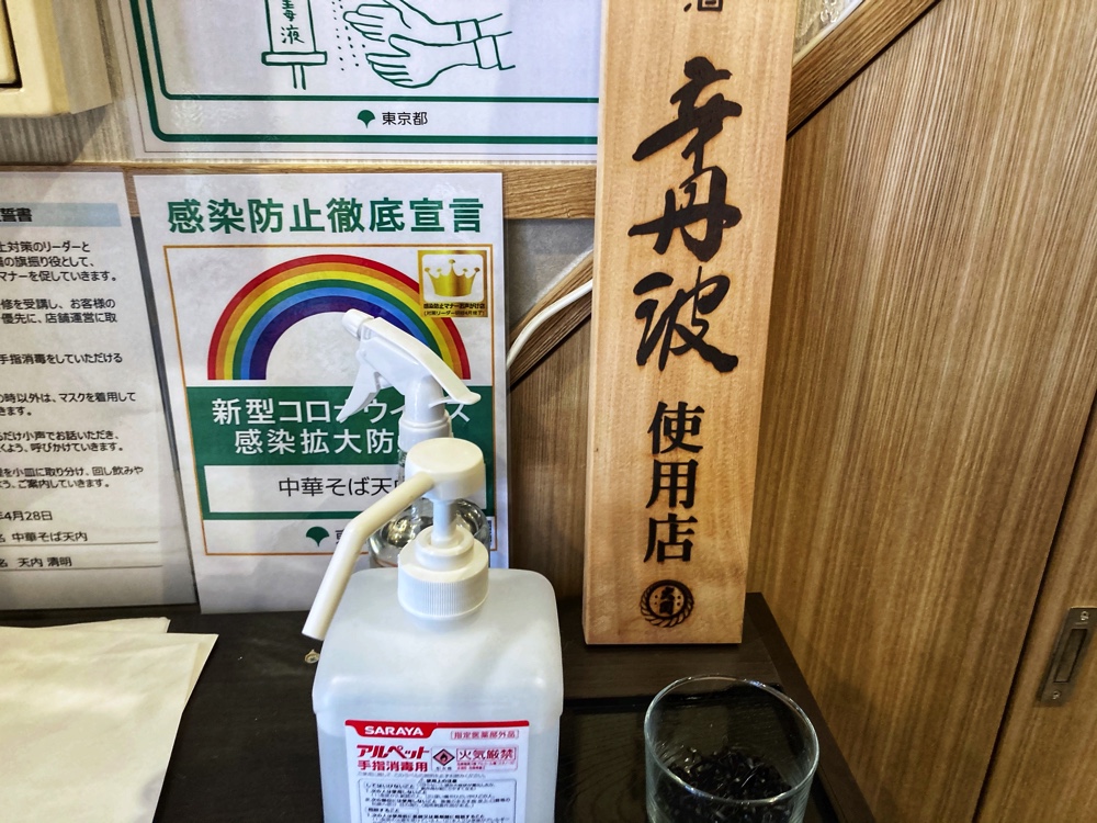うーん、悩むところですねえ。ですが、ここはお店のイチオシであろう元祖京都ラーメン750円をポチリ。元祖というのが、もう期待感満載です。食券機の隣にあるアルコールで手指消毒を済ませます。
