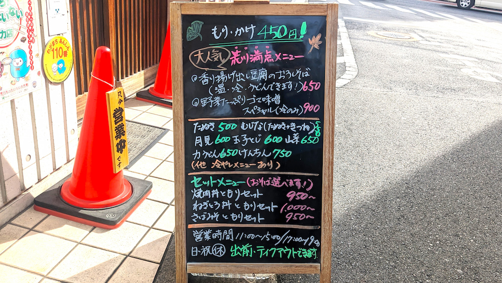 看板には『もり・かけ450円!!』と書かれており、その安さと町の老舗の蕎麦屋さんというたたずまいに惹かれて入店。
