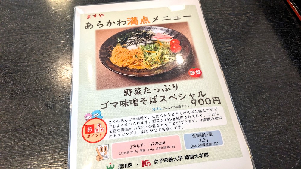 荒川区と区内の飲食店、女子栄養大学短期大学部が連携し、健康に配慮したメニューの開発をおこなった『あらかわ満点メニュー』も「野菜たっぷりゴマ味噌そばスペシャル」と「香り揚げ出し豆腐のおろしそば」の2種類があります。