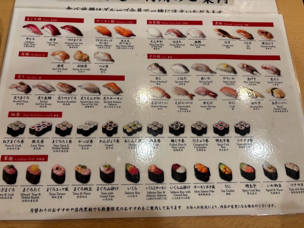 写真付きのお寿司のメニューがあります。わかりやすく、英語もあり、外国人にも優しいですね。