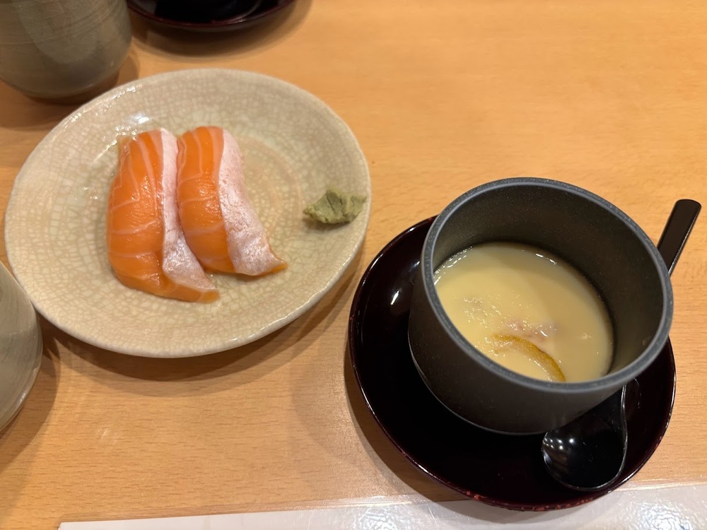 まずは限定お寿司のトロサーモンと茶碗蒸しがきました。