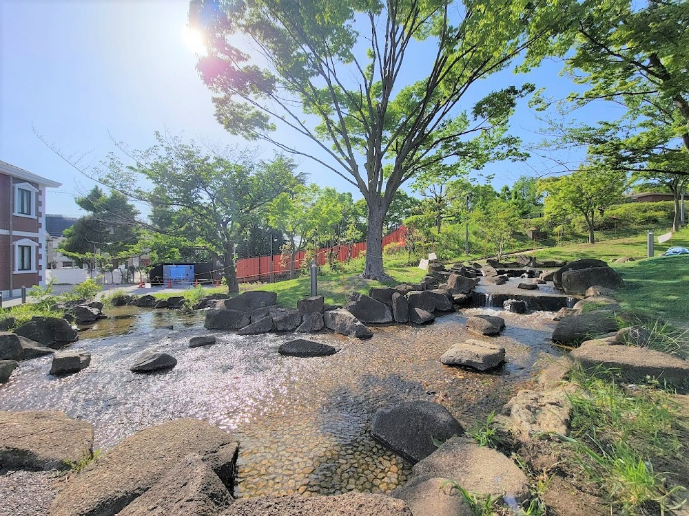 乗り物以外にも水あそびができる広場があって、自然豊かな風景に心が和みます。