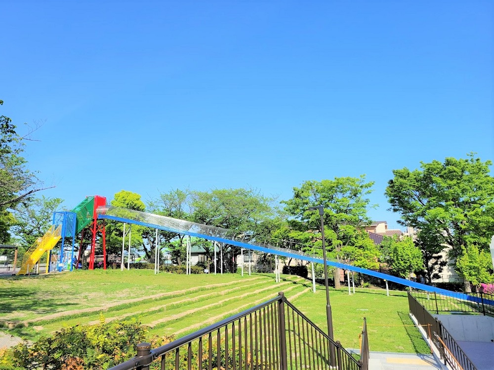 園内の奥にある芝生広場には、ロング滑り台があります。
