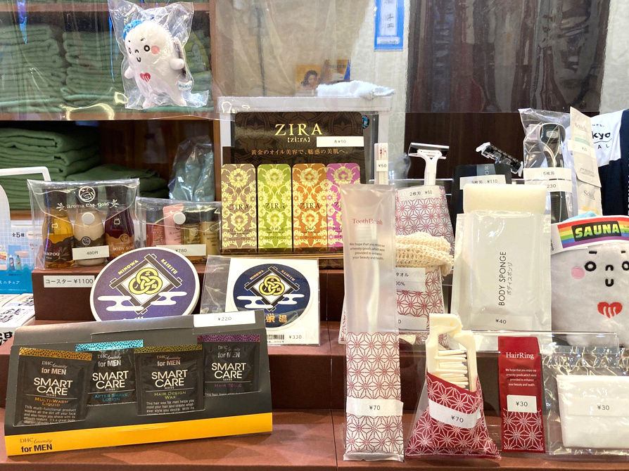 銭湯でラグジュアリーとはいかに?と思っていたら、さっそく納得です。エントランスにはアロマの香りが漂い、受付には高級なアメニティセットが販売されています。聞くと、中で使用しているシャンプーやおすすめのキットなのだそう。お風呂場に備え付けられているシャンプーやボディソープは、安心して使用できるものなので、気に入ったら購入できるというわけです。わざわざ自分のシャンプーなどを持参しなくても大丈夫。フェイスケアやアロマオイルも販売していて、手ぶらで来ることができます。