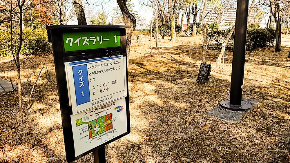 少し進むと、クイズラリーの看板を発見!なんとこちら、季節によってクイズの内容が少し変わるようです。どの季節に来ても楽しめそう。広さを活かした園内の工夫、ステキです。楽しんで園内を回れそうですね。クイズは全部で10問あるようなので、気になる方はぜひチェックしに行ってみてください!