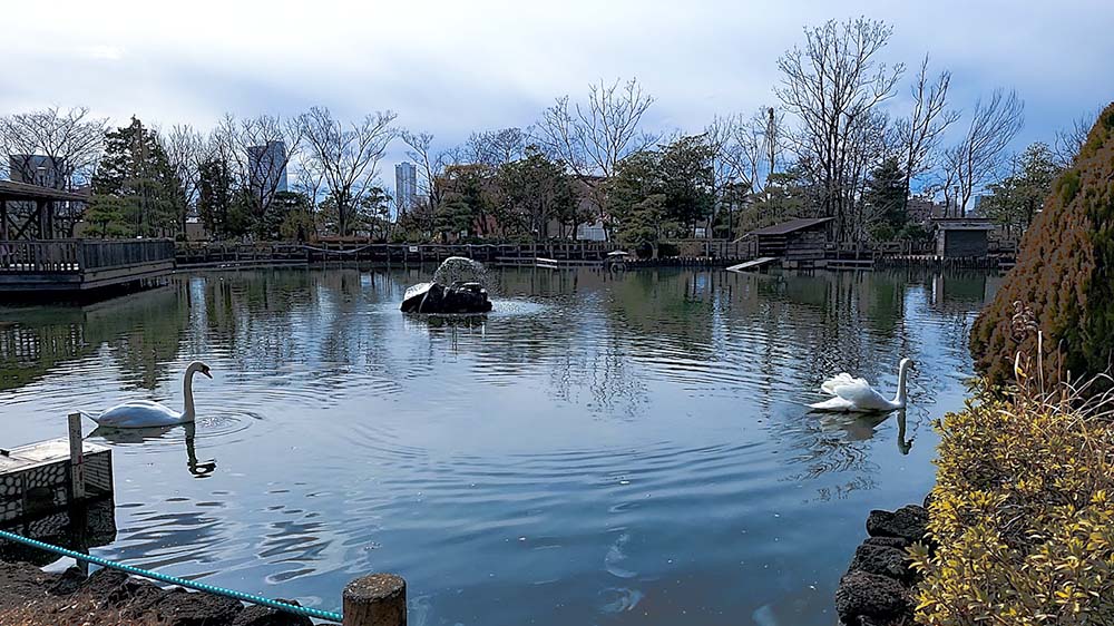 白鳥の池という大きな池には2羽の白鳥が気持ちよさそうに泳いでいます♪ この池ではカモも見られるそうですが、時期によって会えるカモの種類が違うみたいです。私が行った時には小屋に入っていたのかお会いすることはできませんでした、残念。