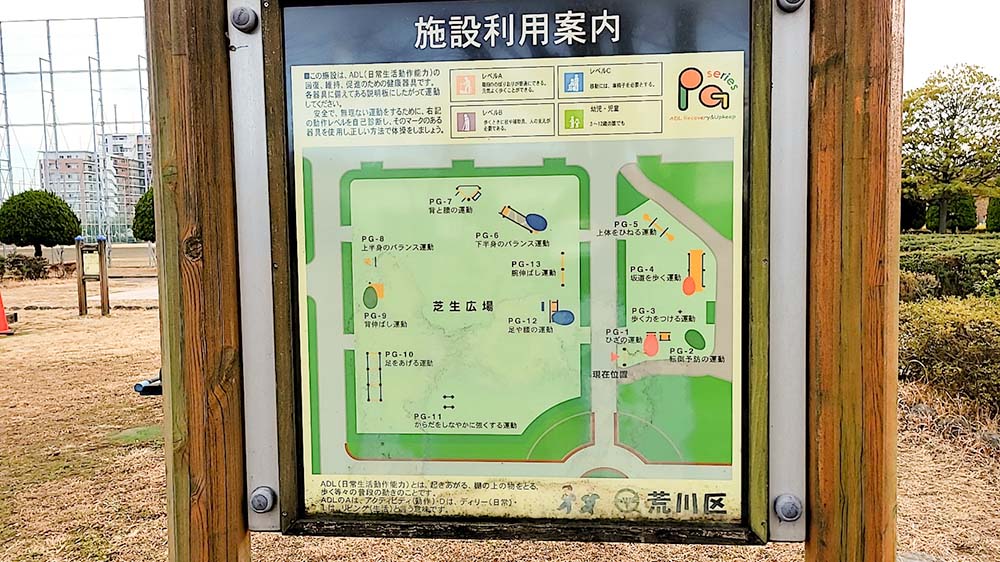 大人向け健康器具として、「ADL」と呼ばれる日常生活活動能力の回復、維持、促進のための器具が13種類設置されています。ご高齢の方や体力低下が気になり始めた方に良さそう!私が小さい頃に来た時は、こんな健康器具まであるなんて気付かなかったです。