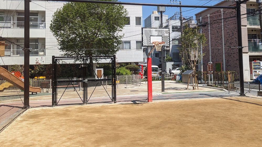 ネットは高い位置まであるので、ボールが迷子になる心配もありません。バスケットゴールが設置されているのもうれしいですね。