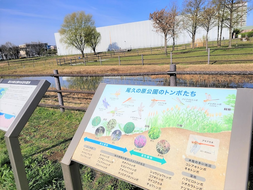 「都立尾久の原公園」にはトンボ池という池もあり、さまざまなトンボが紹介されている看板がありました。約30種類のトンボがいるそうですよ。トンボが飛ぶ季節になったら広い芝生でトンボの姿が見られるのでしょうか?昆虫好きのお子さんはとっても喜びそうですね。