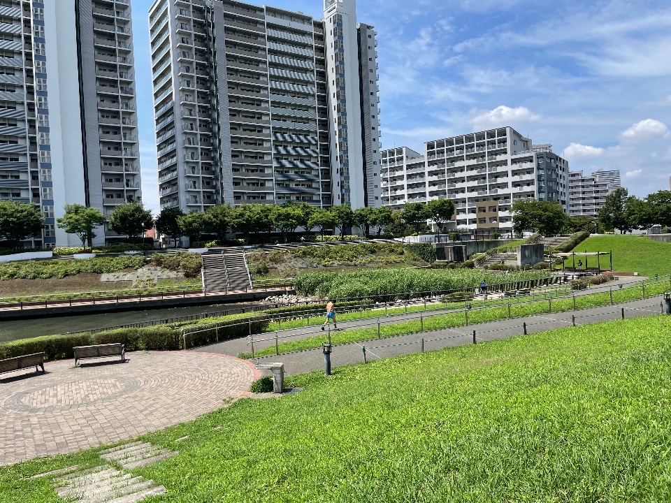 向かいには高いマンション群があるのですが、写真の左側には公園の名前の由来となっている「瑞光橋」があり、その下を水が流れ、上を人々がランニングしたりジョギングしたりしています。