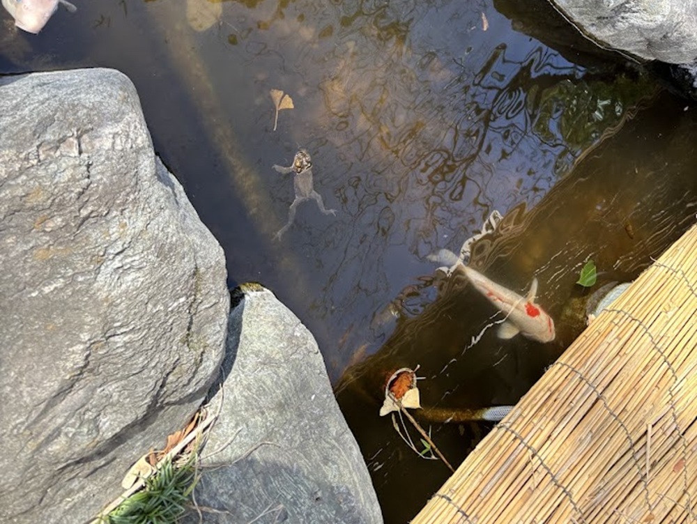 池の中には鯉だけでなくカエルもいます。カエルは大きめでプカプカと浮かんでいる姿がとてもおもしろくて、子供も興味津々で観察していました。