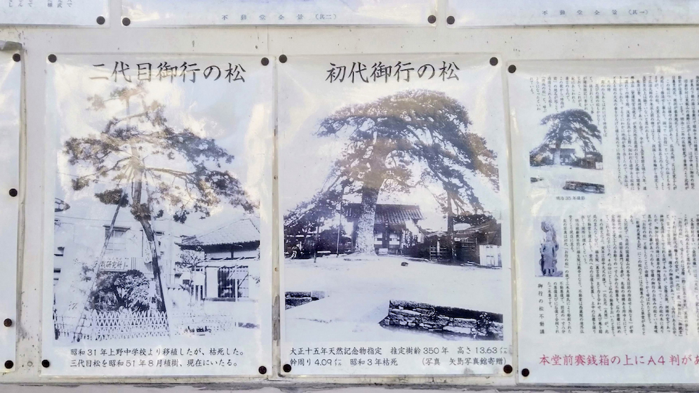 いつもは通り過ぎていたお寺の前でふと「このお寺の名前って何だろう」と思い確認すると、御行(おぎょう)の松不動尊と書いてありました。どうやら境内にある立派な松が御行の松のようです。