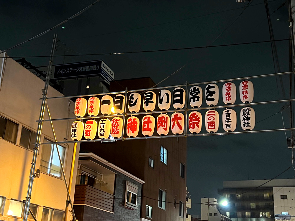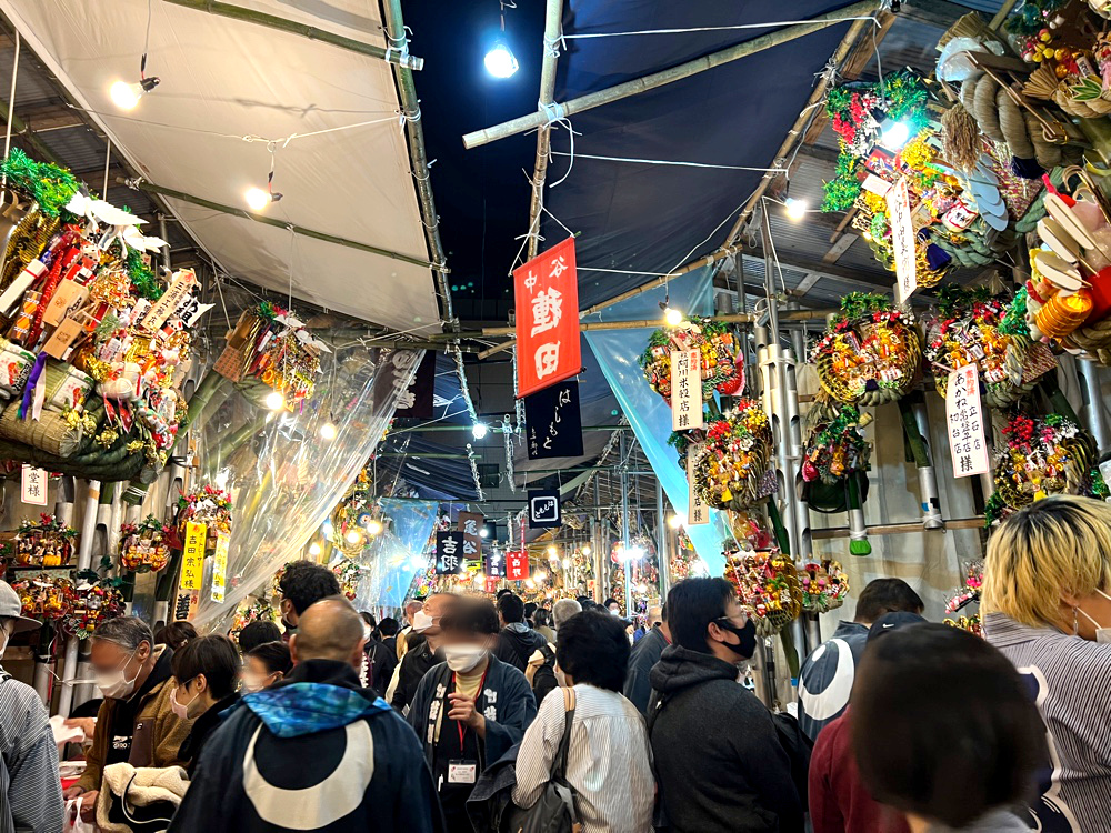 商売人が商売繁盛を願って、毎年賈う熊手を大きくして行くことが習わしとなっていて、その熊手のきらびやかな装飾や威勢のいい掛け声は圧巻。