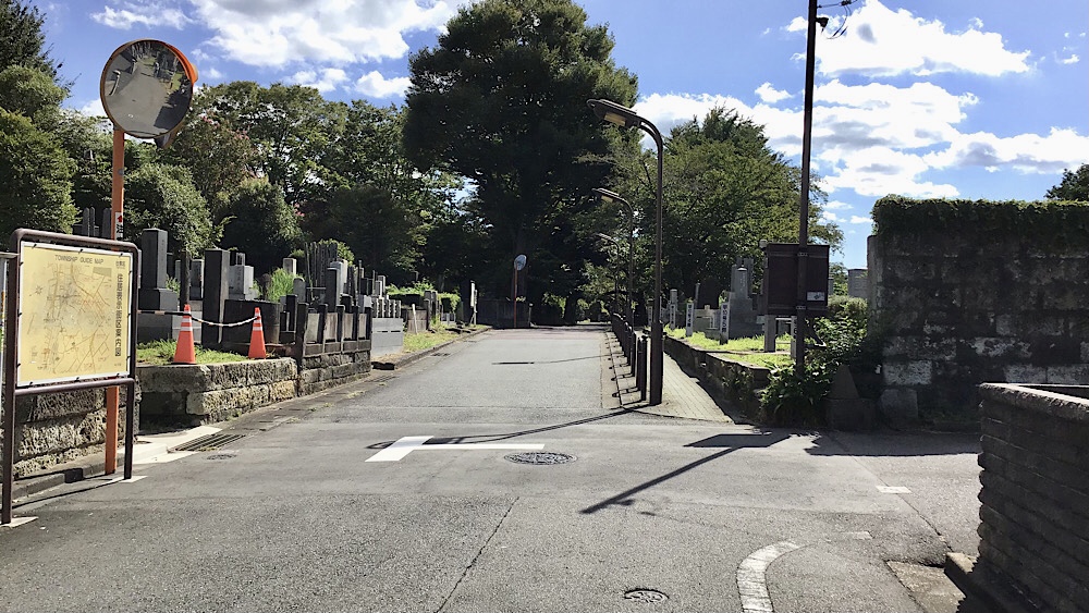 前方に進むと江戸時代には上野の寛永寺のあたりまで長い道が続いていたようですが、この先は霊園なので今回はここで引き返すことにします。