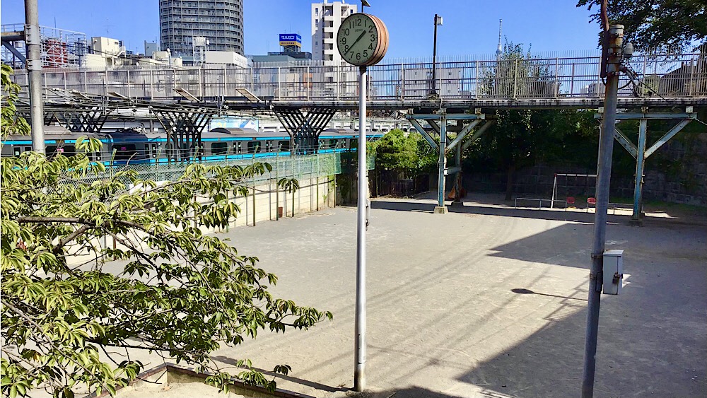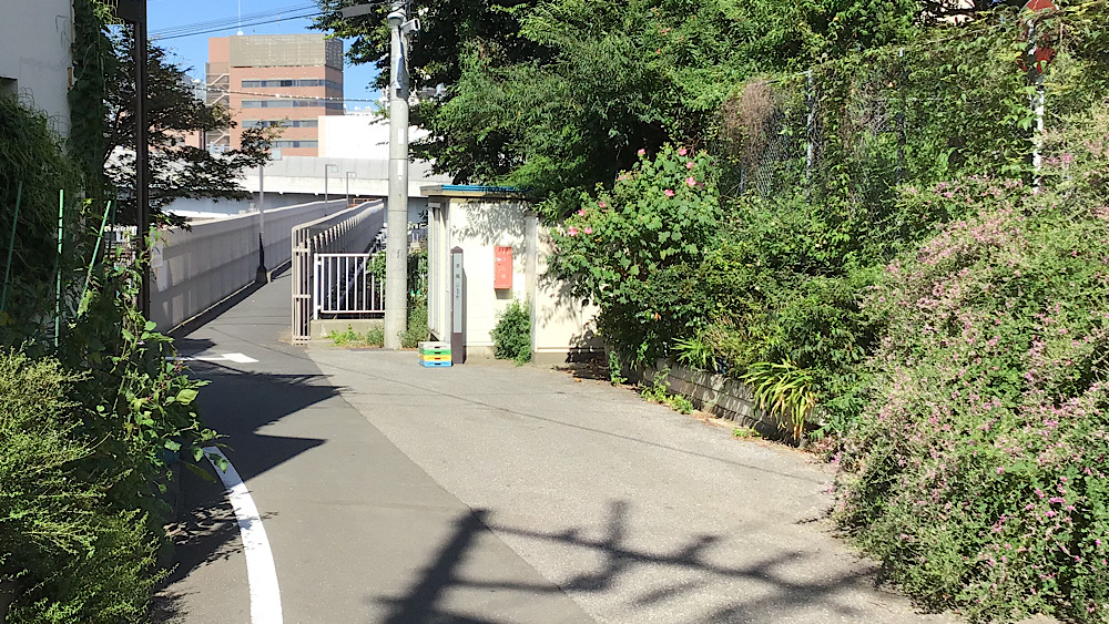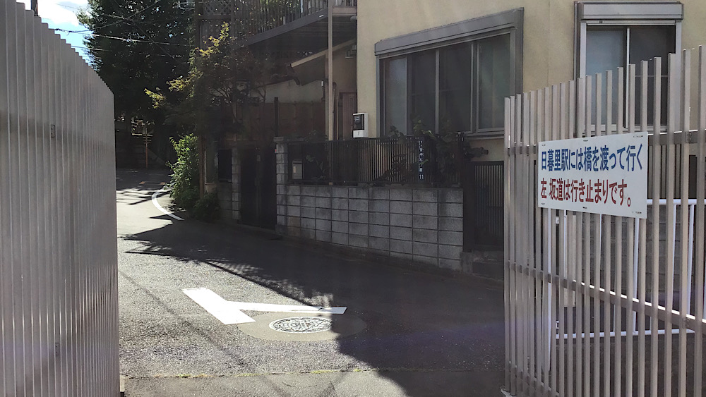 跨線橋まで戻ってきました。谷中側から見て左手の坂道は「行き止まりです」と書いてありますが、下っていくと「芋坂児童遊園」があります。
