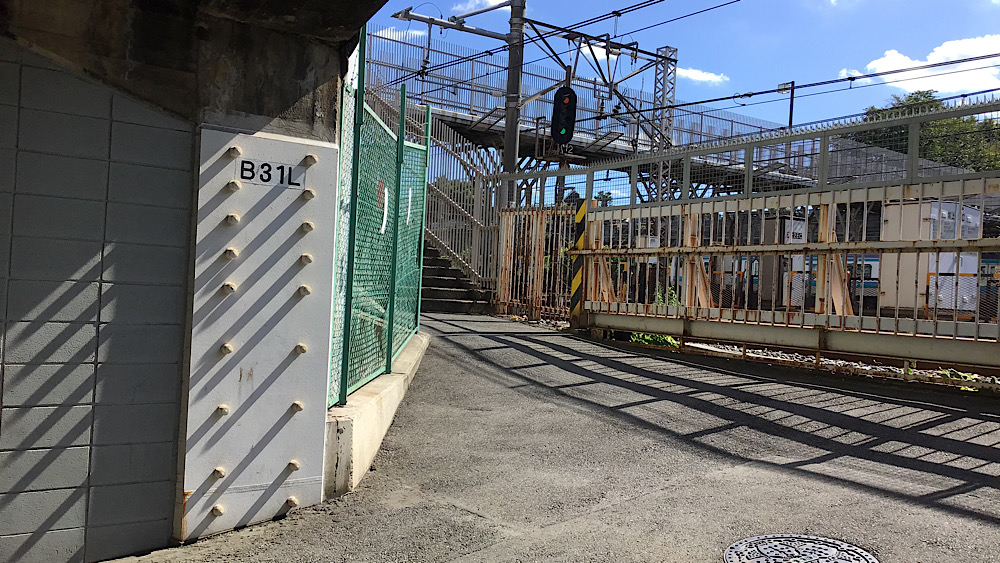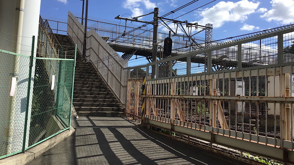 跨線橋の階段を降りたこの場所が、先ほど行き止まりになった場所と踏切でつながっていました。