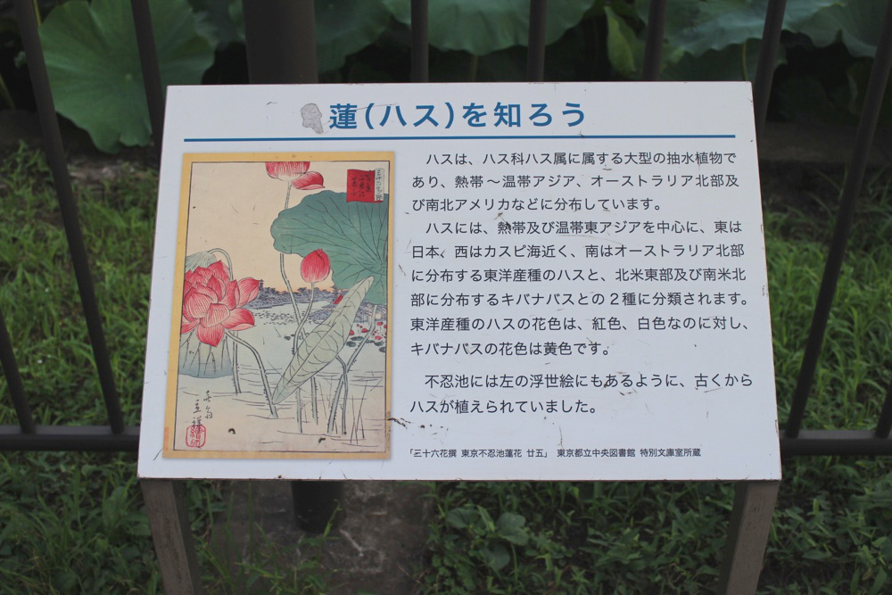 蓮池は古い浮世絵に描かれていたり、和歌に詠まれていたりと古くから親しまれているようですが、いつ誰が植えたのかは解っていないようです。ただ、いろいろな言い伝えがあり、植えたのは寛永寺の和尚という説や、弁天島を作った人物という説があるようです。