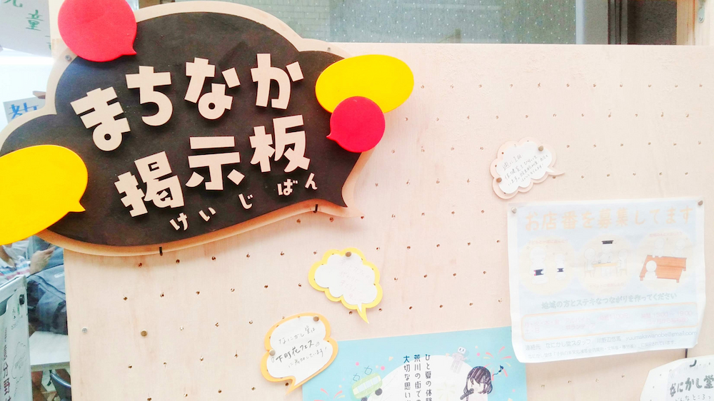 なにかし堂の前には、まちなか掲示板があり、ジョイフル三の輪のイベントの案内や街の人の声が掲示されていました。