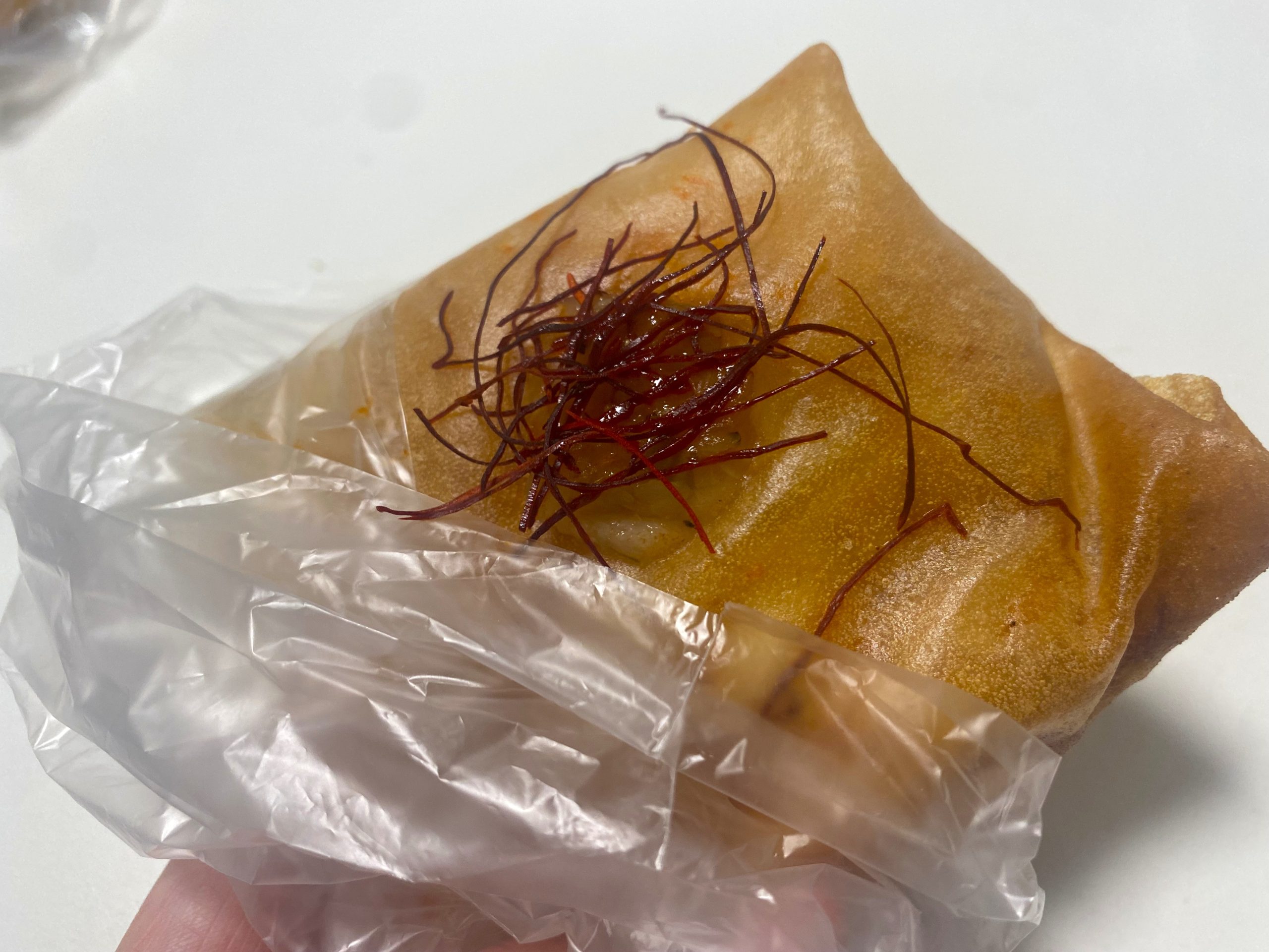 エビチリが詰まったパンを春巻きの皮で巻いて揚げられており、パリ・もちっとした食感がおもしろいです。