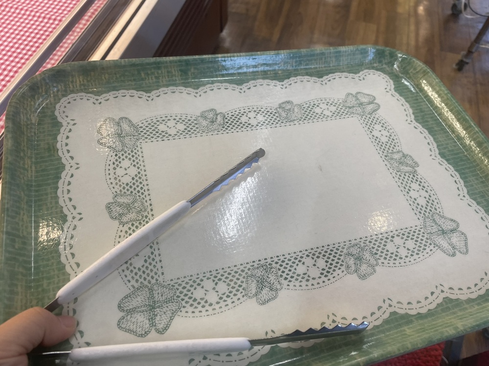 レトロで落ち着いた雰囲気のたたずまい、お店に入ると、目の前にはトレイとトング。レースのふちどりがかわいらしいなトレイです。