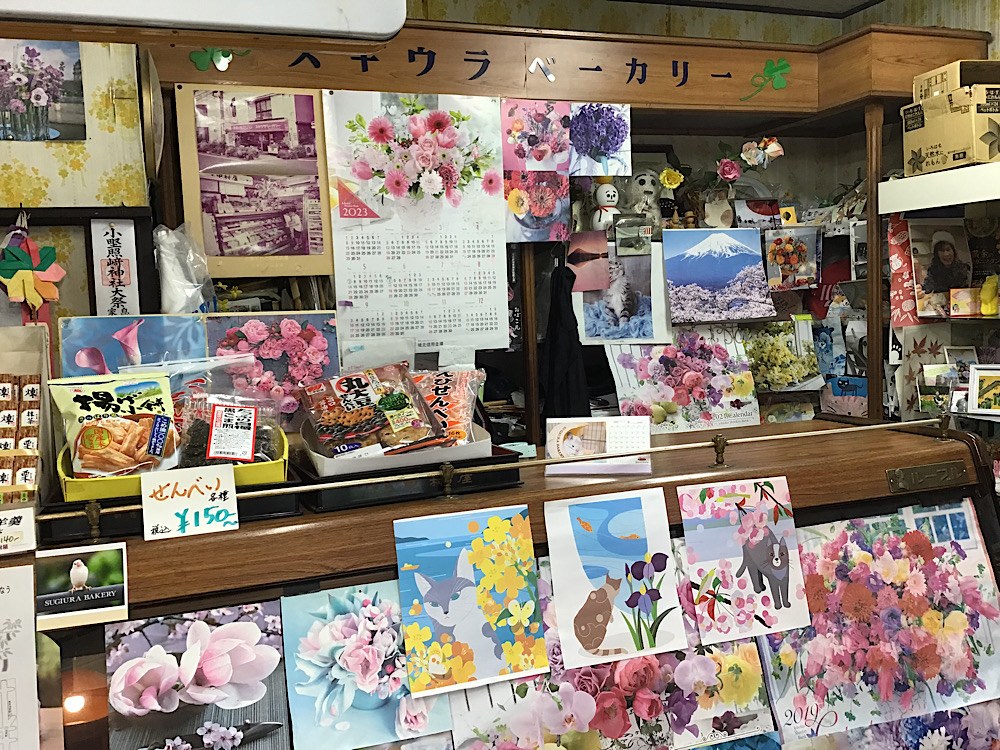 お店の中も、パンと一緒に思い出の品がたくさん並んでいます。なんだかレトロな看板もかかっていますね。それもそのはず。スギウラベーカリーは昭和20年から続く老舗だからです。
