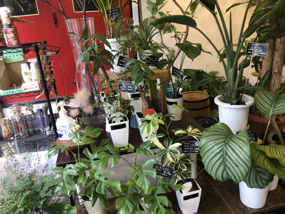 お店の外に並ぶ観葉植物、ズラリとお花が並ぶ店内がよく見えます。