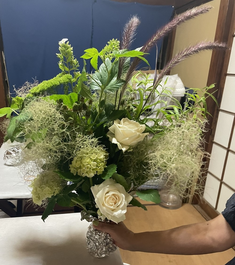 この日はバラやアジサイ、スモークツリー、たくさんの種類の枝物が準備されていました。ご好意でワークショップの様子も少し拝見させていただきました。
