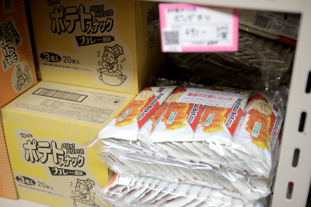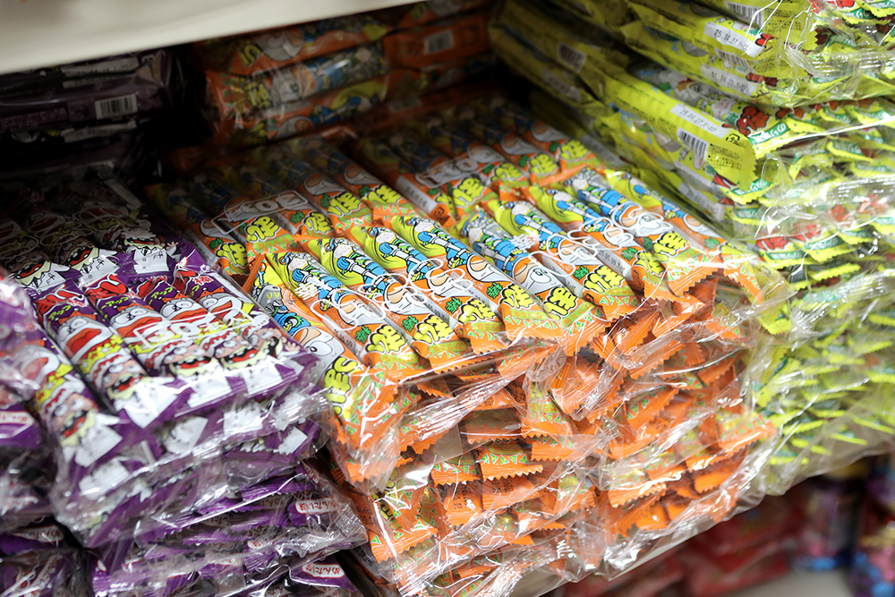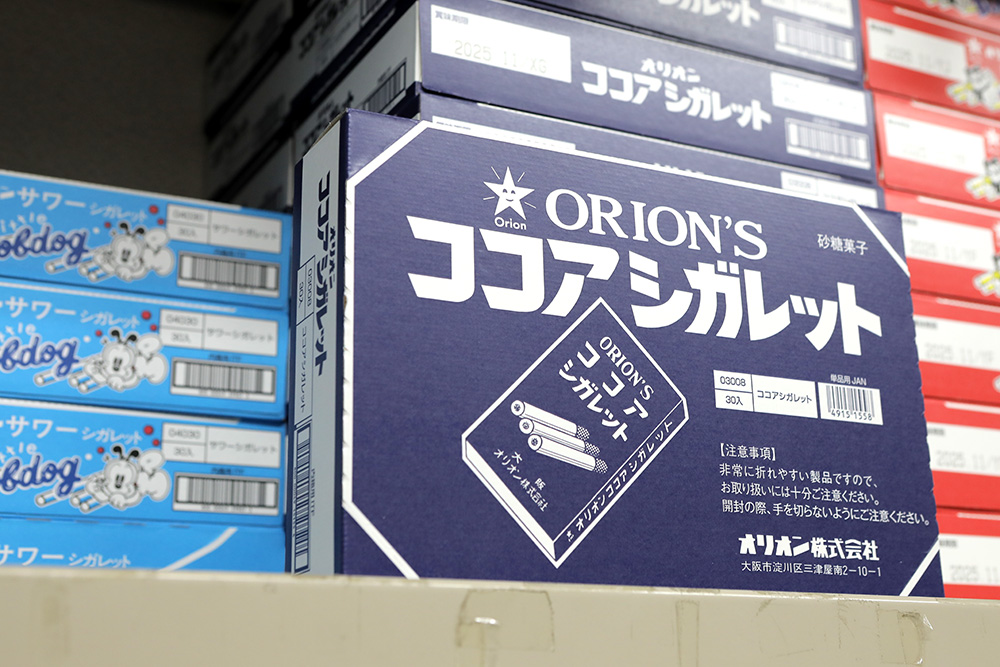 他にも、ごはんのおかずにもなると噂の「BIGカツ」、青のりの味が香ばしい「キャベツ太郎」、タバコを吸う真似をした人も多い砂糖菓子「ココアシガレット」、紙袋に入ったあられ「餅太郎」、当たりが出たらもう一個のフルーツガム「マーブルフーセンガム」などなど、駄菓子屋さんでよく見かける商品が並んでいます。