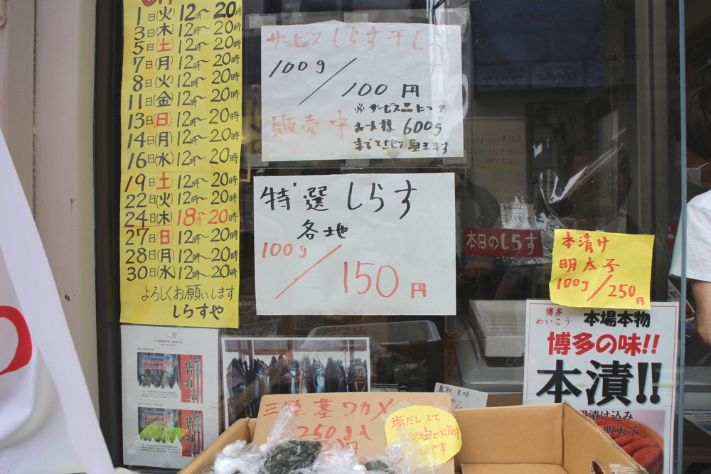 ワクワクしながら並んでいる間に、店前の張り紙をチェックします。サービスしらすが、100グラム100円、特選品も150円という破格のお値段です。そのほかに、ワカメや干物、明太子がとにかくびっくりするお値段です。