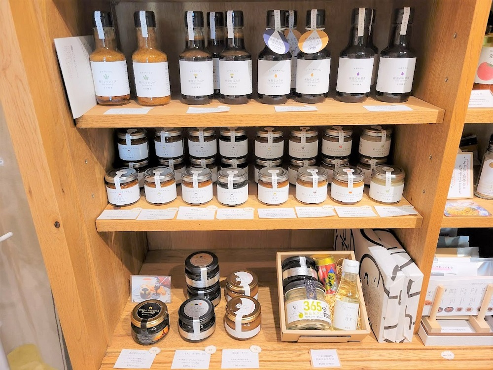 ごま油や醤油、お酢、ポン酢、野菜ドレッシングといった調味料もズラリと並んでいますが、どれも特別感あふれる身体に良さそうなものばかり。