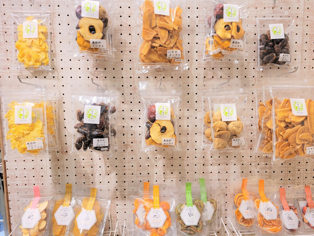 上段と中段にあるのは大分県、下段は岐阜県の無添加商品なんだそうです。食べ比べるのもたのしそう!さつまいもと柿のドライフルーツが人気だそうですよ♪