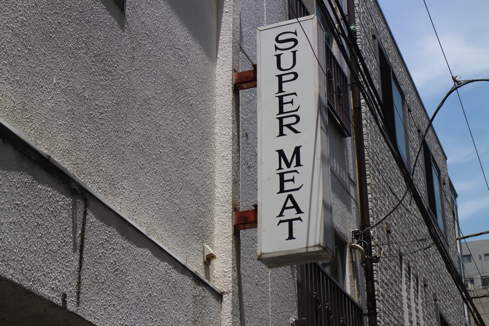 入谷駅すぐ近くの「スーパーミート」さん。お肉屋さんがどこにあるのかしら?と思って歩いても近くに行くまでわからないお店のたたずまいです。だって、白い壁の建物に看板がひとつ青空に映えているだけですから。
