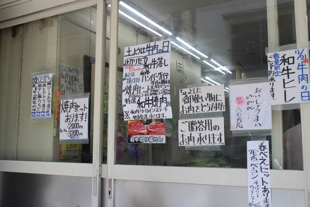 お店の前には購入を待つ人の横に、立て看板がありました。私は土曜日に販売される牛肉の切り落としをねらって来たわけですが、ほかにも心引かれるお肉がたくさんあります。