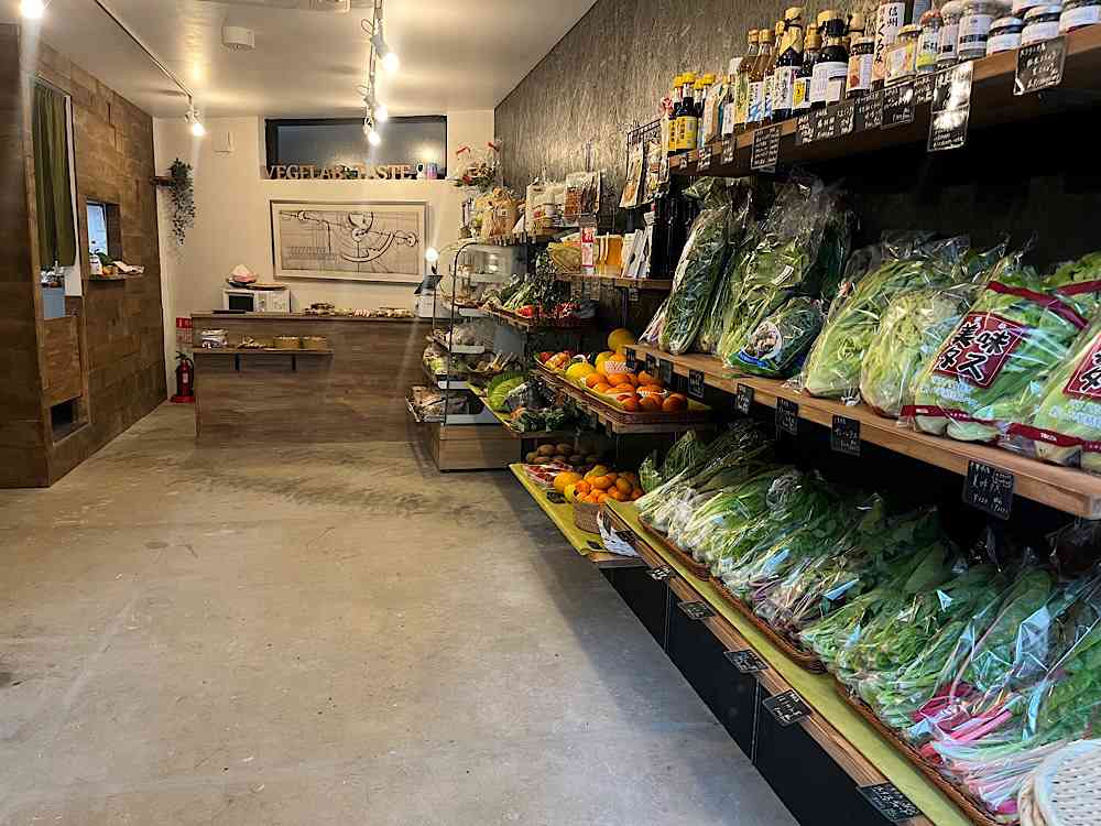 店内に入って右手の棚には、たくさんのお野菜やフルーツが並んでいてカラフルです。