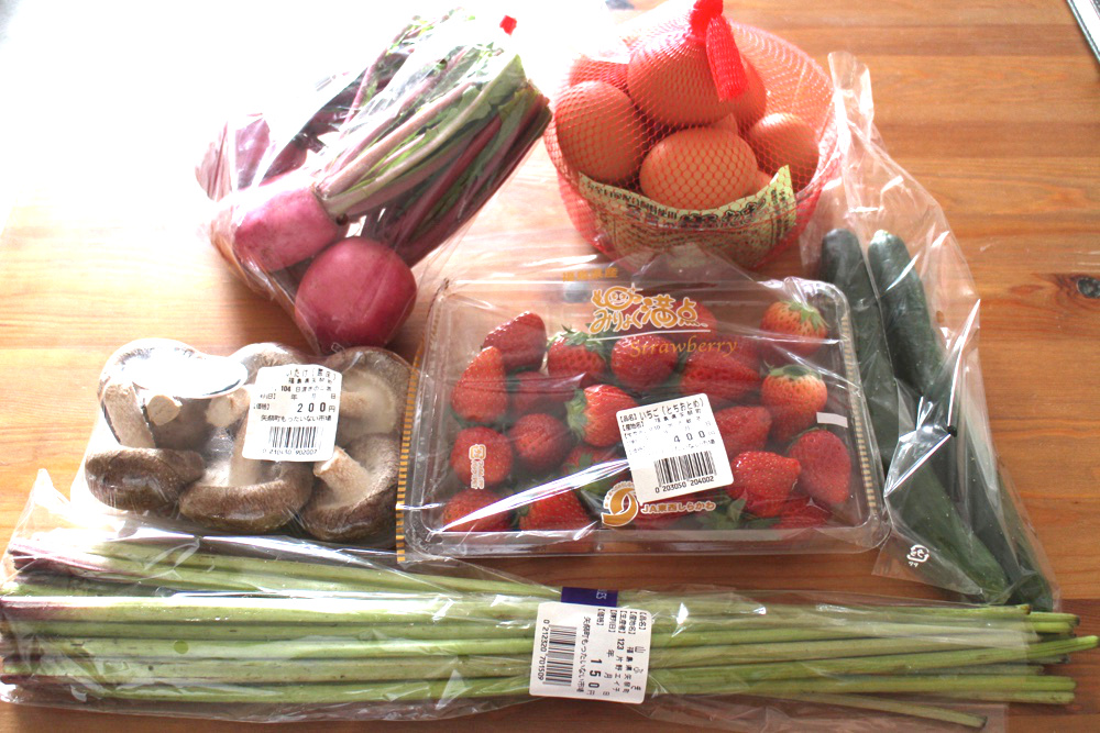 矢祭ファームのたまご、赤カブ、しいたけ、イチゴ、キュウリ、フキ。