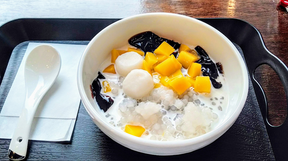 出てきたのは、仙草ゼリーにマンゴー果肉、タピオカパール、白玉がトッピングされたスイーツです。
