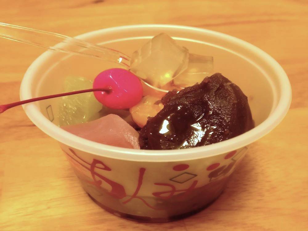 「あんみつカップ」はカップの中に寒天とえんどう豆、その上にこしあん、ぎゅうひ、フルーツが分かれて入っています。別添えの黒蜜をかけていただきます。