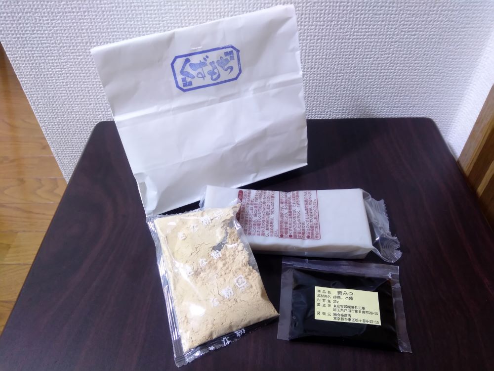 「くずもち」は大きな棒状のくずもちを切って、同封のきなこと黒蜜をかけていただきます。