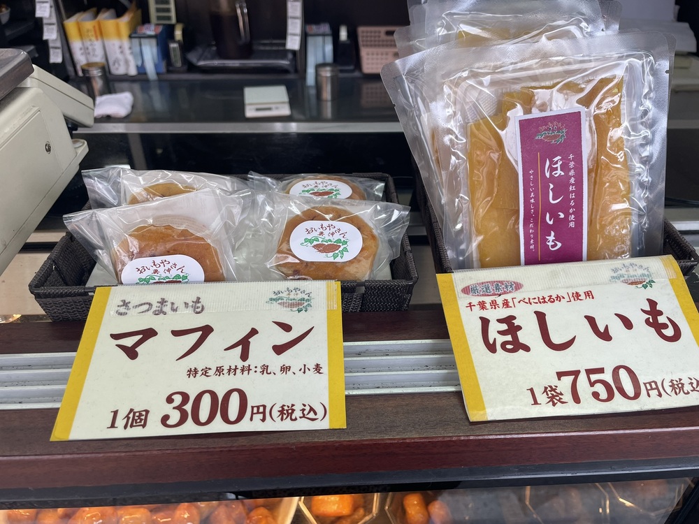 正面に移動してショーケースを見ると、たくさんのさつまいもスイーツが…キラキラと光っています!!