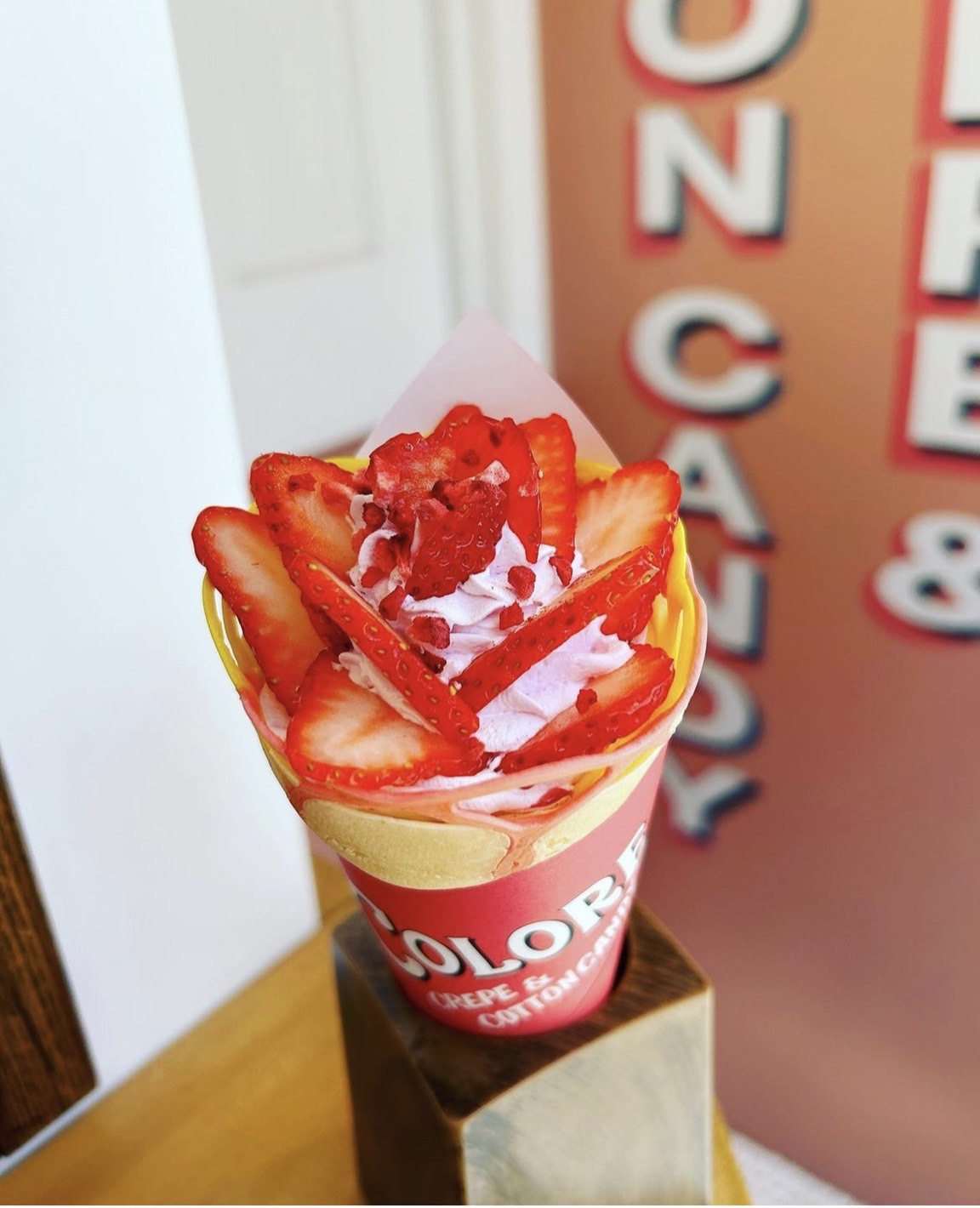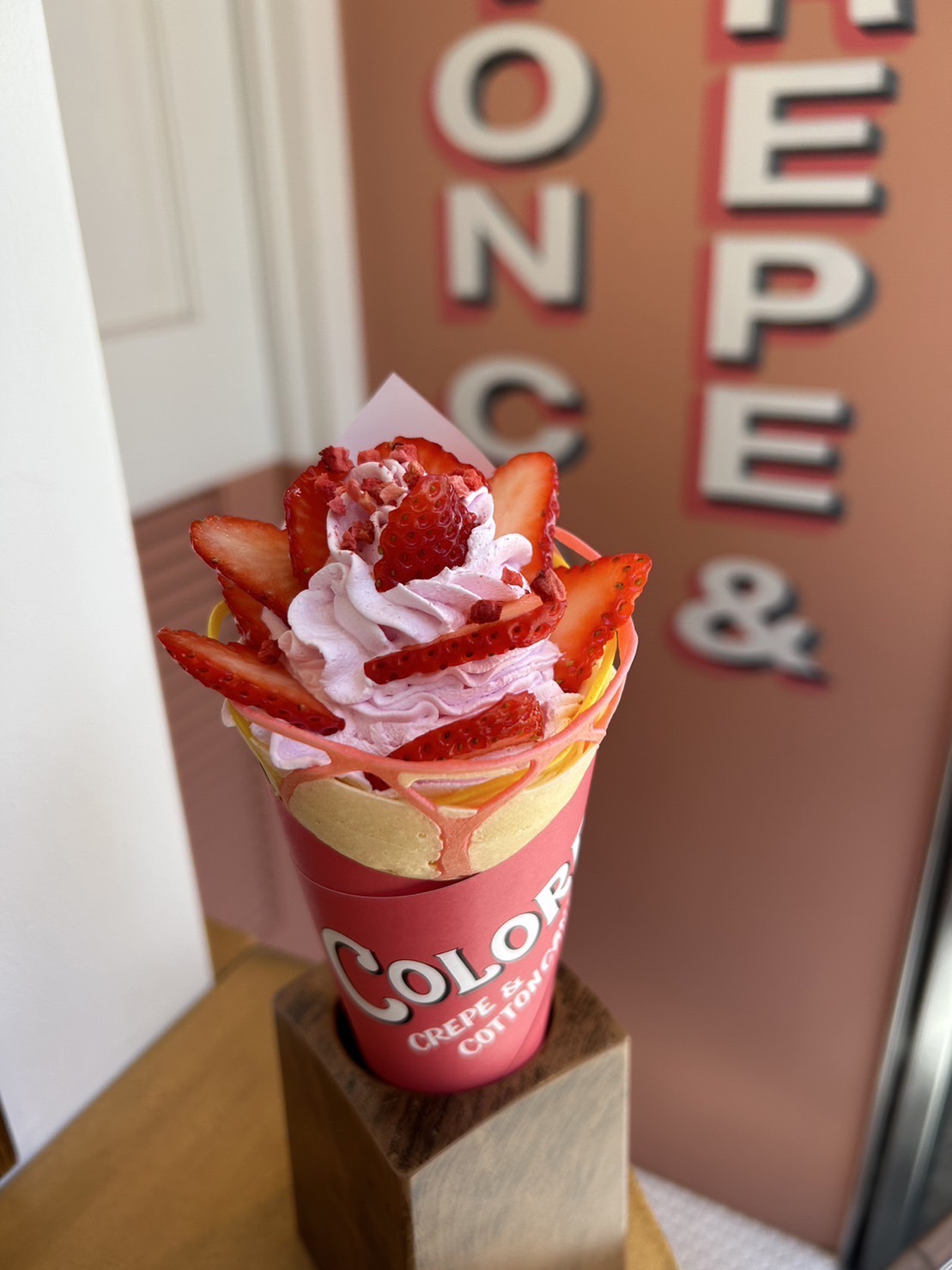 ピンクのお店で買ったかわいいクレープやわたがしを食べ歩き。ワンコインで童心に帰って、ちょっと特別な日にできます。
