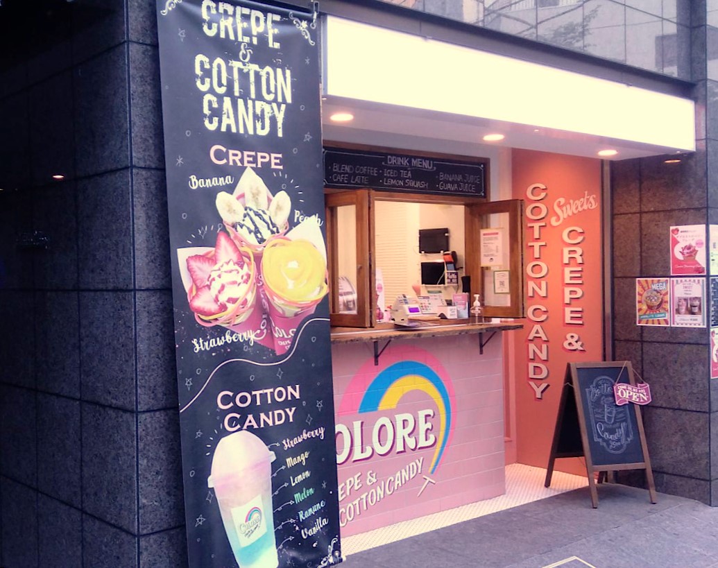 お店の大きな垂れ幕には、クレープと、もうひとつの看板商品が載っています。一見ジュースやかき氷にも見えるのですが、上には「COTTON CANDY」の文字が。