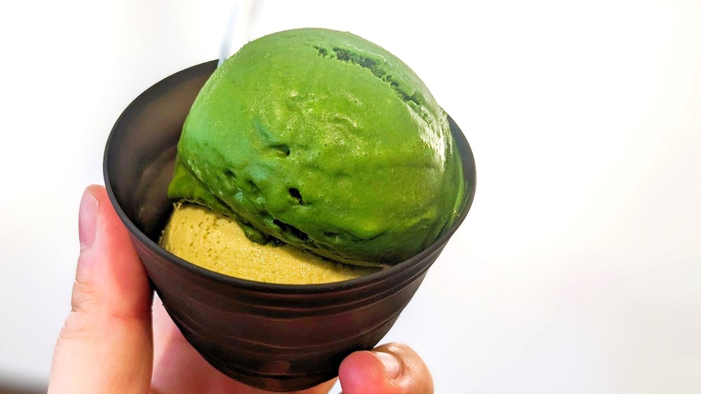 世界一濃い抹茶と爽やかな玄米茶ジェラートの相性は抜群。この2つをチョイスした、数分前の自分を褒めたいくらいにマッチしています。