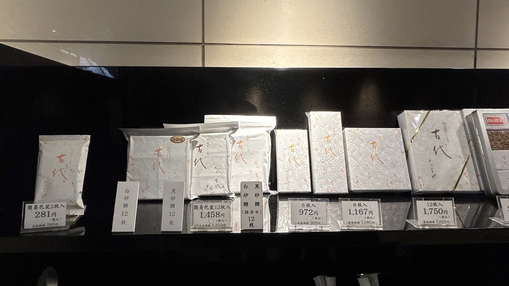 こちらの商品は、店名にもかかげている「古代」という雷おこしを中心に展開しています。古代は贈答用に利用されることが多いそうで、缶や化粧箱入りは48枚入りから6枚入りまで、通常の包装のほか仏事用のものもそろえています。