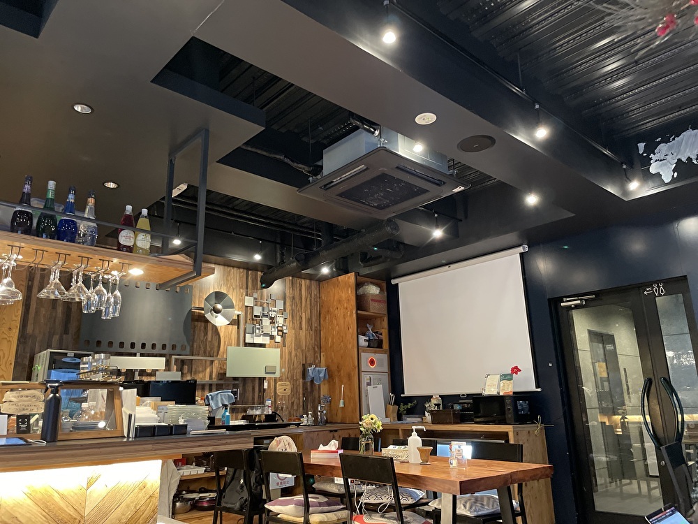 ホステルとサウナが併設した共有ラウンジ1Fにあり、カフェ以外のお客さんとの共有スペースにありました。