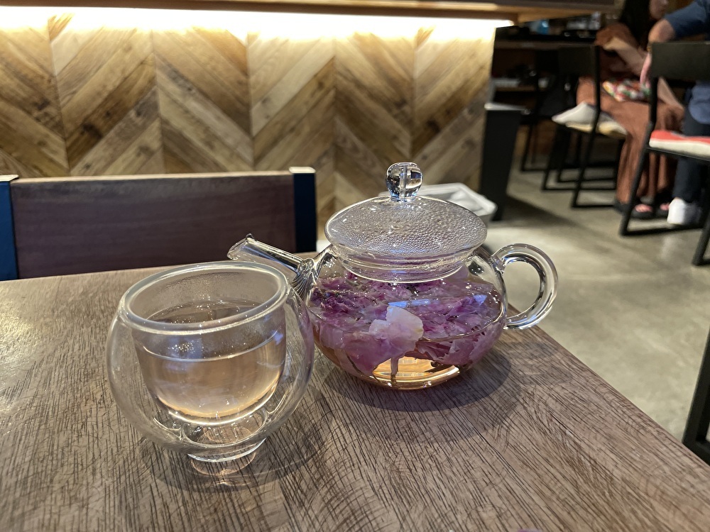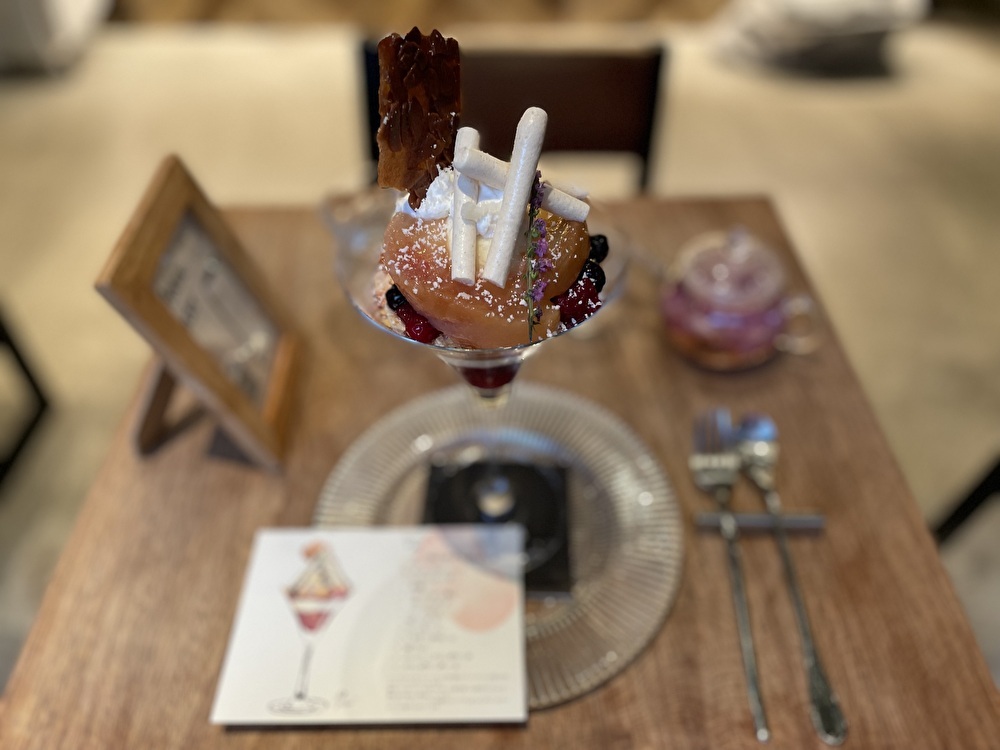 4分ほど蒸らすとほんのりバラの色がついて、バラの繊細な香りがしてきます。パフェとともに楽しむことでさらに華やかなひとときになりそうですね。香り高い花茶とともに、パフェの甘さもさらに引き立っていました!