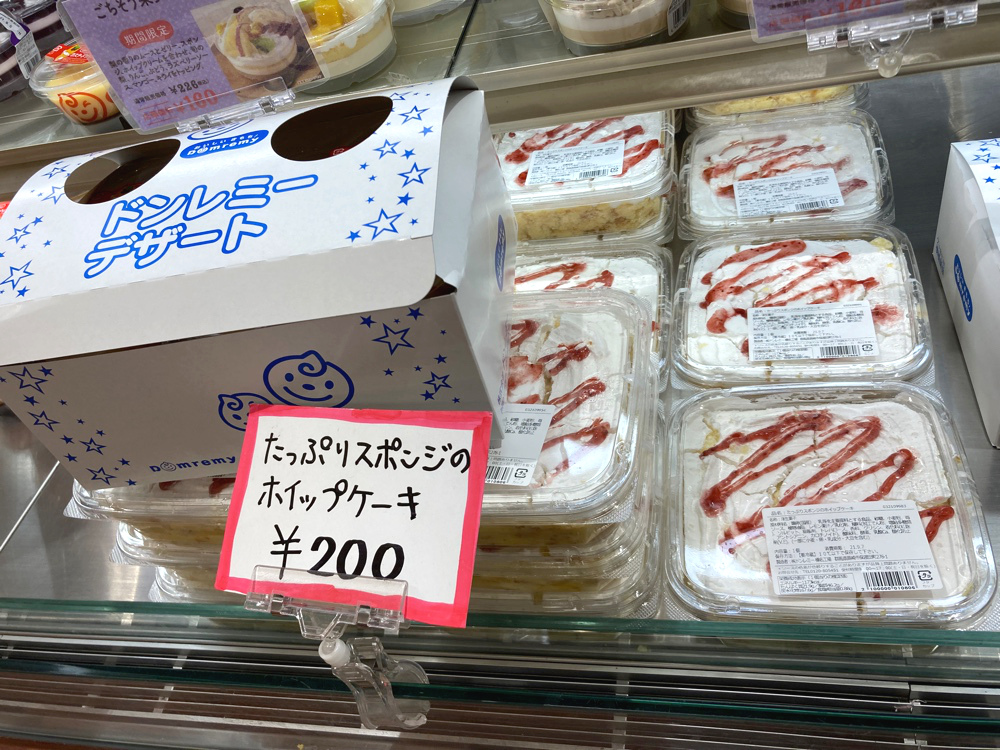 それと、スポンジにクリームとイチゴジャムがたっぷりのホイップケーキ200円。大食い番組に出てきそうな迫力です。しかもどれだけ買ってもOKの制限なしです。