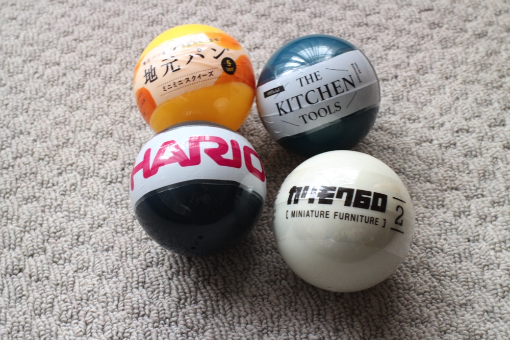 さんざん悩んで、ご当地パン、キッチンツール、ガラスメーカーのハリオ、家具のカリモクのガチャを買いました。