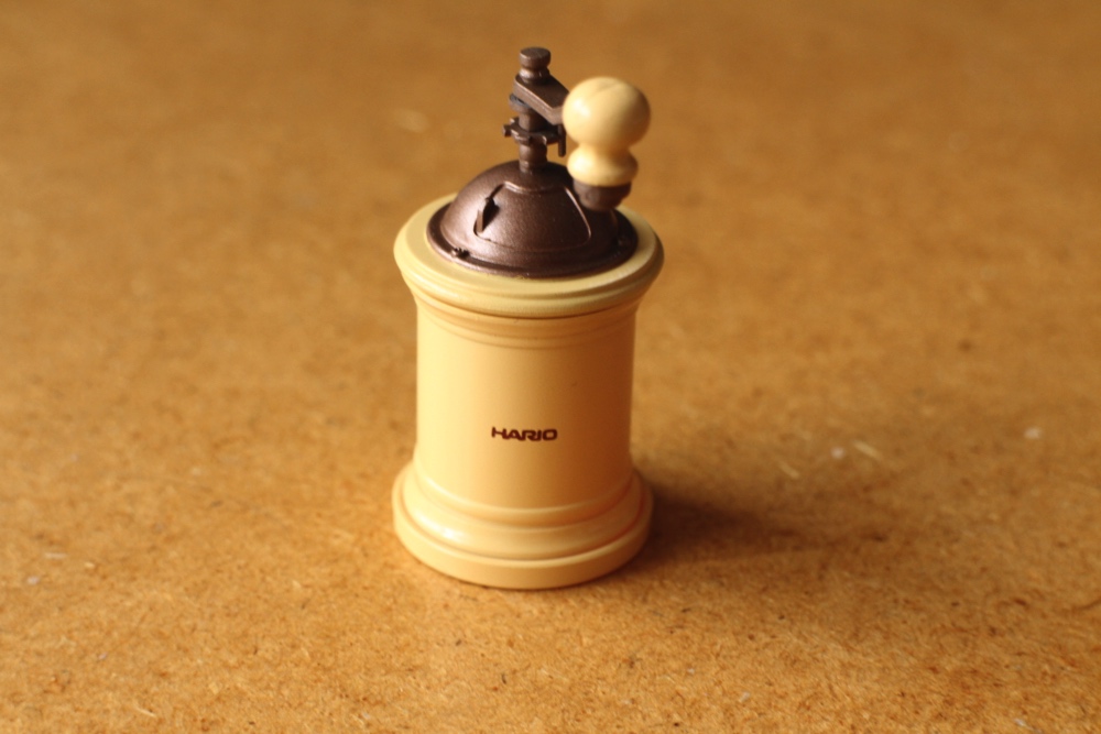 このフォルム、この精巧さ。ハリオのコーヒーミルです。これで豆を挽いてコーヒが飲めそうです。写真の見方によっては、ミニチュアに見えません。